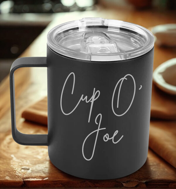 Start your morning adventure with a mug as bold as you are. Our 12oz powder-coated camper mugs are made from double-wall stainless steel and laser engraved with your personalized design — a name, monogram, logo, or favorite phrase that stays crisp and permanent, no matter where life takes you.